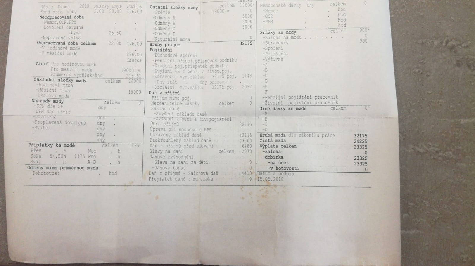 Ahoj, mám práci, ve které jsem za rok odpracoval 443 hodin přesčasu. V žádné výplatnici nemám přesčasy vůbec vedené. Namísto toho mám "prý" přesčasy vedené v kolonce Ostatní složky odměny C vždy nějakou částkou ke které vůbec nevím jak došli. Posílám v příloze mou výplatnici z dubna.Např. když v práci jsem reálně 214,5 hodiny, tak jak je možné že ve výplatnici mám vedeno pouze 176h. Mohl byste mi někdo osvětlit údaje, které jsou na té výplatnici?